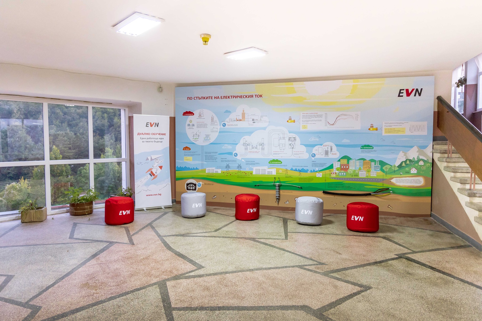 Чрез рисунки, схеми, формули и реални елементи образователната стена представя производството, преноса и разпределението на електрическата енергия, а цветната визия придава позитивно настроение и свеж облик на пространството. С двете нови образователни стени общият брой изградени такива са вече 6. Освен тях, такива има монтирани и в училища в Пловдив, Бургас, Ямбол, Кърджали. За по-приятна и спокойна училищна среда, дружеството инвестира и в реновирането и обзавеждането на EVN класни стаи. На такива вече се радват ученици от Пловдив, Бургас и Ямбол.