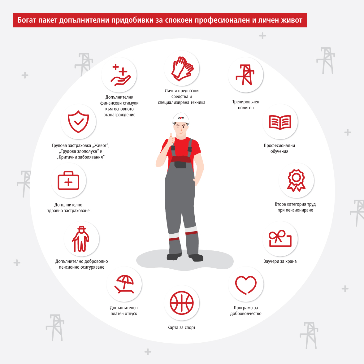За нас е важно да влагаме време, енергия и ресурси, за да се чувстват електромонтьорите ни мотивирани и сигурни на работното си място. Ако и ти станеш част от нашия свят, ще се възползваш от богат пакет допълнителни придобивки и възможности за развитие.
