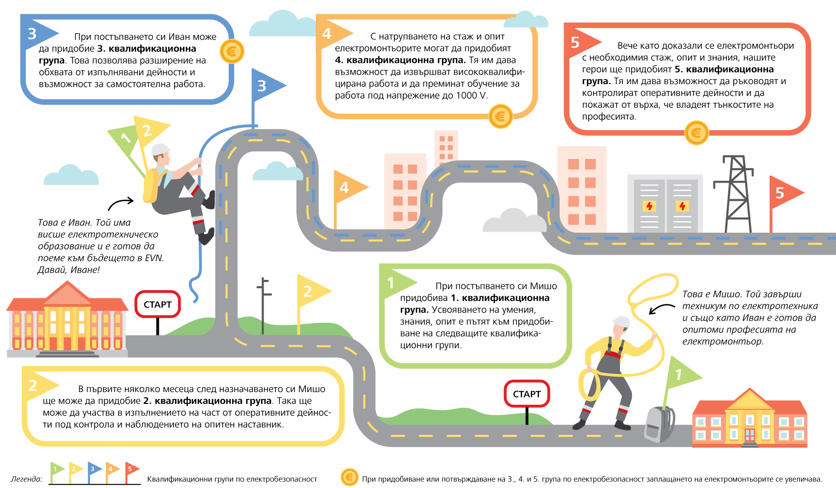 Придобиването и потвърждаването на квалификационни групи в EVN е подкрепено от опитни вътрешни обучители и е изцяло покрито финансово от компанията. Виж изображението в по-голям размер.